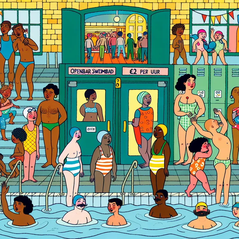 Kleurrijke cartoon van een openbaar zwembad met diverse bezoekers van alle leeftijden en achtergronden, toegankelijk voor iedereen met brede ingang, hellingbanen en leuningen