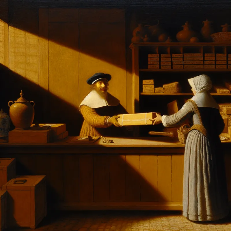 17e-eeuwse Nederlandse postkantoorscène in Rembrandt-stijl met postbediende die een pakket overhandigt aan een klant