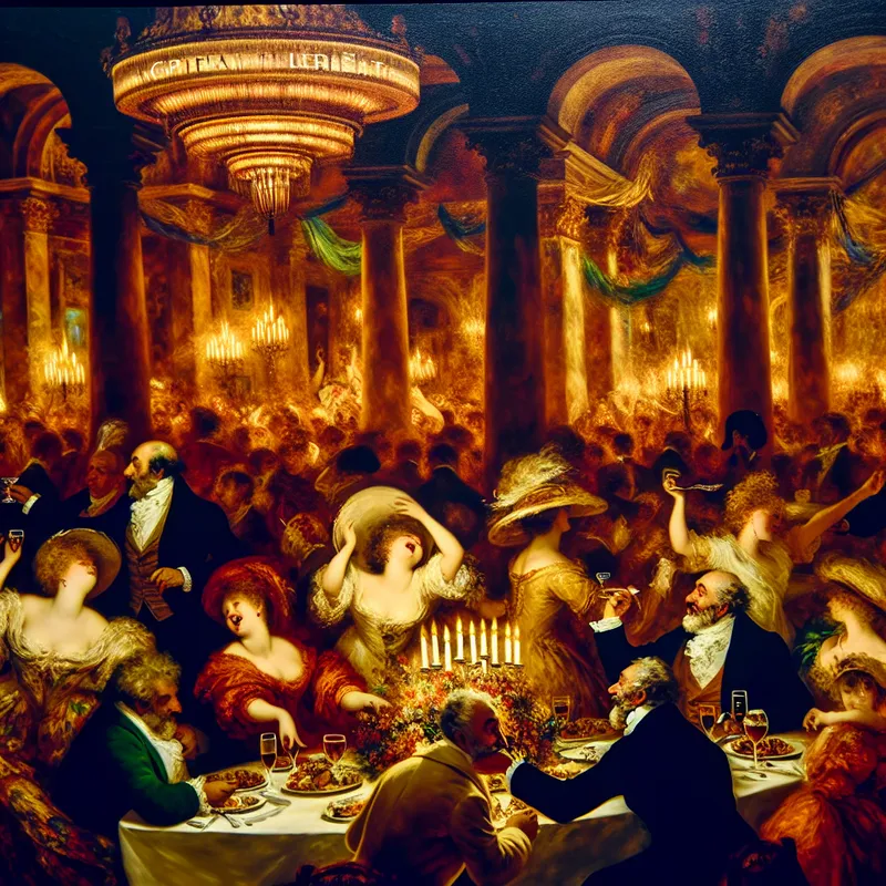 Barokke restauranttafereel met vrolijke gasten die genieten van een uitstekende maaltijd, met een bord 'Prima' als teken van hoge kwaliteit