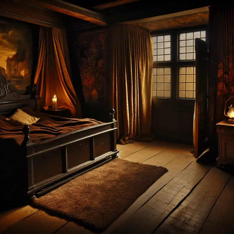 17e-eeuwse Nederlandse slaapkamer in Rembrandt-stijl met houten bed, olielamp en warme aardetinten