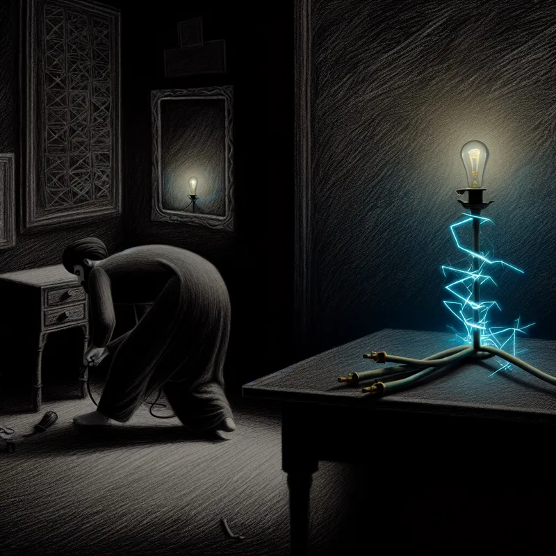 Donkere, gotische kamer waarin een persoon een lamp vervangt met een doorgesneden elektriciteitskabel waar blauwe vonken uit komen, symboliserend de afwezigheid van stroom