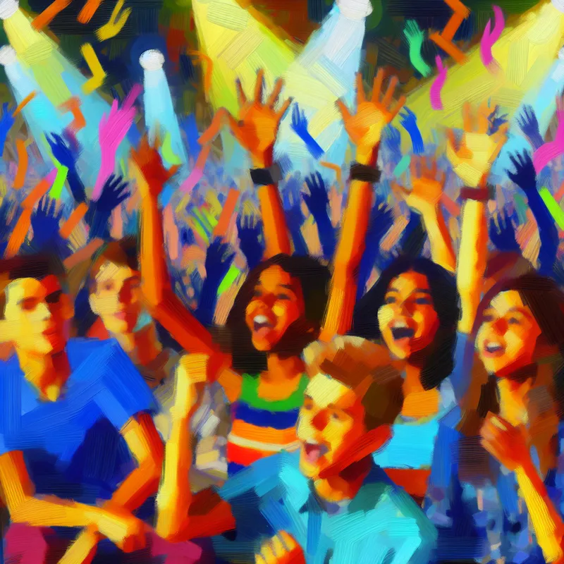 Abstracte voorstelling van een groep enthousiaste tieners op een levendig concert, met felle kleuren en dynamische penseelstreken die de uitdrukking 'vet leuk' uitbeelden in jongerentaal