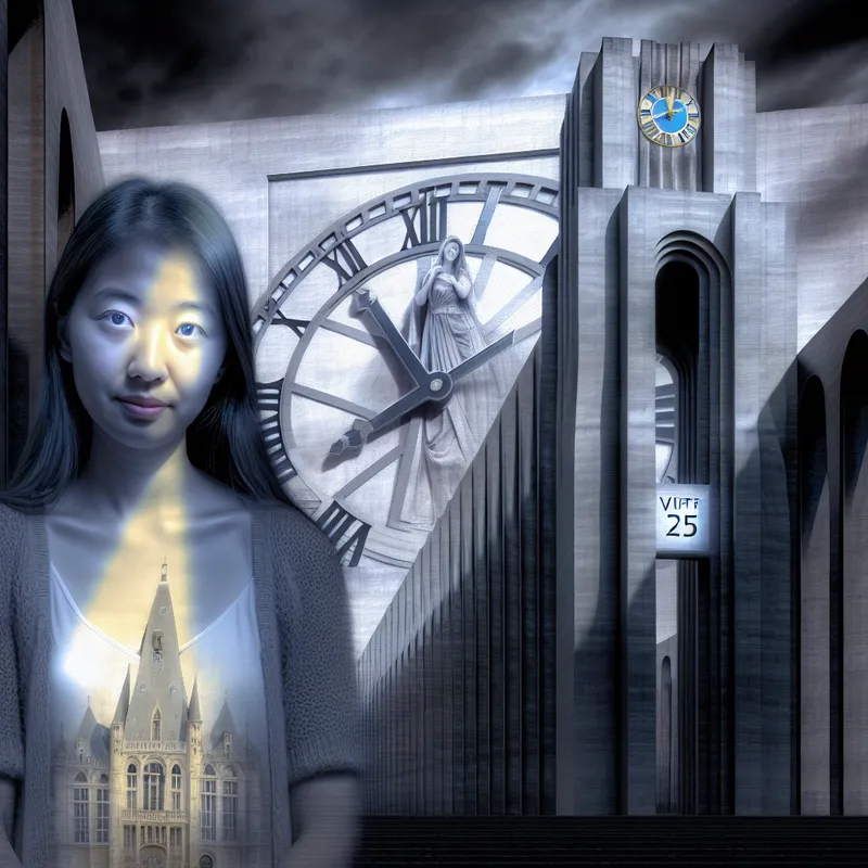 Hyperrealistisch surrealistisch schilderij van een jonge vrouw bij een klokkentoren met het getal vijfentwintig, symboliserend leeftijd, tijd en kosten