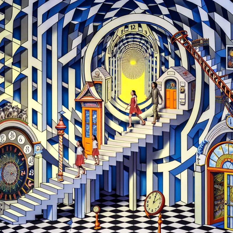 Surrealistische trap in M.C. Escher-stijl met dagen van de week, waarbij 'zaterdag' opvalt met een gezin dat naar een pretpark loopt