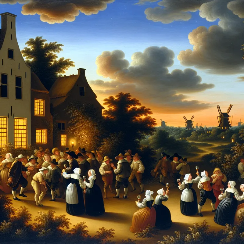 17e-eeuws Nederlands landschap bij zaterdagavond met gezellig dorp, mensen die wijn drinken en praten onder een dramatische avondlucht met windmolens