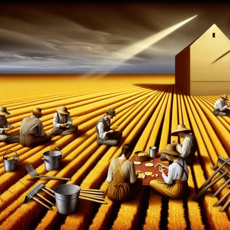 Tijdens de schoft aten de boeren hun brood op het veld.